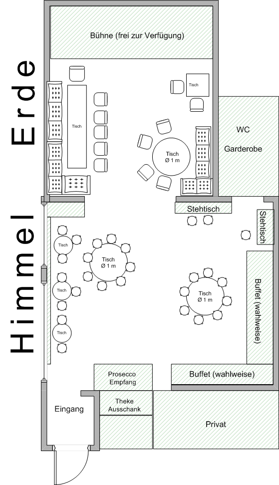 Hier der Raumplan von unserem Lokal. Fahrt mit der Maus auf den Plan, dann seht Ihr dazu entsprechende Bilder oder hier der Plan in groß zum Ausdrucken.Steh- und Sitzgelegenheiten Erde: 30 PersonenHimmel: 45 Personen